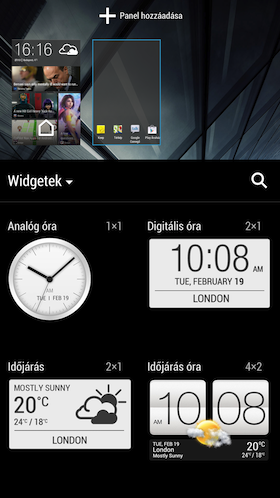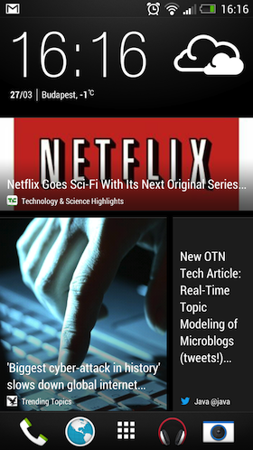 A képernyőzár feloldásakor rögtön szembetűnik a Blinkfeed, mely leginkább egy metrósított hírfolyamra hasonlít, melybe a felhasználó Facebook-, Flickr-, LinkedIn és Twitter-fiókja, valamint naptára mellett számos szolgáltató bevezethető. A történések időrendi sorrendben, szépen animálva érkeznek, a nagy felbontású képekkel sincs gond. A konfigurálás során meg kell adnunk, hogy mely országról szeretnénk értesülni, a témaköröket és szolgáltatókat ez alapján ajánlja fel a rendszer, melyek eltérnek egymástól, így az ember nem feltétlenül tudja összeollózni az érdeklődésének megfelelő tartalmakat. Egyelőre nincsenek magyar tartalmak, azonban hamarosan hazánk híreit is olvashatjuk majd a folyamban. Bár a funkciót kikapcsolni nem lehet (azaz mindig ott lesz a Blinkfeed az oldalak között), természetesen nem muszáj használnunk a szolgáltatást, a főképernyő lapjai továbbra is szabadon testre szabhatóak. Ezt segíti a rengeteg egyedi minialkalmazás is, melyek között a rémhírekkel ellentétben továbbra is megtalálható a HTC készülékek stílusjegyének számító Sense Clock, azaz az időjárást és az időt mutató widget.