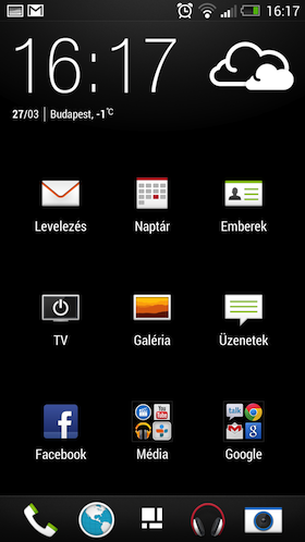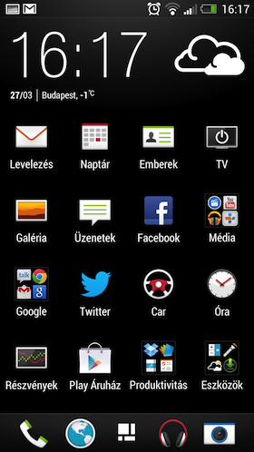 Az alkalmazásokat listázó menüt meglátva elsőre sokkot kaptam: egy sorba mindössze három parancsikon fért, köztük óriási hézaggal. Szerencsére ezt seccperc alatt orvosolni lehet, a soronként négy piktogram már sokkal kényelmesebb a szemnek. A HTC-től megszokott kategorizálás (a leggyakrabban használt és a legújabb alkalmazások külön felületre történő kihelyezése) eltűnt, cserébe a listázás módjába lehet beleszólni. Jópofa, hogy itt is elérhetőek a mappák, ez nagyon hiányzik a gyári Androidból.