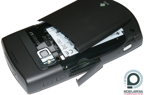 On top of its front, under the HTC logo, we can find the speaker, surrounded by two shortcut keys. In the middle we can see the touchscreen display that has a diagonal of 3.5” and a resolution of 240 x 320 pixels. Basically everything’s all right with quality and we can cope with the size too, which counts as ultra-large nowadays. My personal opinion is, however, that the screen should have VGA resolution, as for example E-TEN puts a 480 x 640 display in almost every device of theirs. On the bottom there are six buttons in an interesting layout, with a 5-way d-pad in the center and a fingerprint-reader below it.
