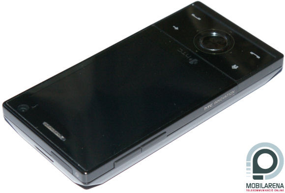 On top, near the sunk power button, we can see the handsfree speaker. On the left there are the volume control keys, while under them there is a label : HTC innovation.