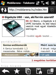So the web browser is Opera Mobile 9.5. I can say without any exaggeration that this is the best browser for this platform. It's very fast, displays web pages nicely, without errors, we can find a great scrolling routine in it, it has tab support, it rotates the picture according to the PDA's orientation, switches to fullscreen mode automatically when starting browsing and it zooms pages nicely. Upon a double-tap it zooms in, but unfortunately it is not as good as Safari from this point of view, as it doesn't always fit to the selected paragraph's width. As an example: we have a 500 pixel wide text box, and upon double-tapping it might happen that we'll only see 400 pixels of it, so some of it will be cut off (usually form the end).