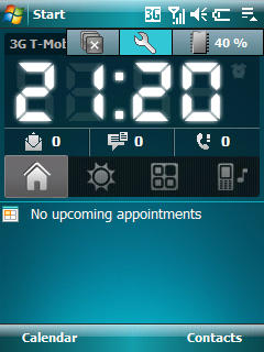 A Touch Slide a gyártó harmadik gépe, mely megkapta a TouchFLO technológiát, valamint az ehhez tartozó plug-ineket. A Today képernyőről ezúttal is egy nagydarab digitális óra nézeget vissza ránk, alatta láthatjuk az elmulasztott eseményeket (új e-mail/SMS, nem fogadott hívás). Középtájt négy gomb sorakozik, az első az órás nézetbe visz, a második egy időjárás-előrejelző, a harmadikban 9 alkalmazás gyorsindító ikonja várja, hogy nyomkodjuk őket, a negyedik pedig a profil és csengőhangválasztó rész.