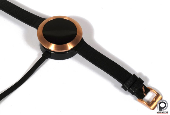 Egy mindössze 25 grammos tömegű, 38 milliméteres átmérőjű, 9,5 milliméter vastag óratest ugyanis akkor sem férfias, ha az éjszakánál is feketébb festékkel borítják, túlságosan pici ahhoz, hogy az legyen. Hölgy ismerőseim csuklóján viszont gyönyörűen mutatott a vörös arany árnyalatban pompázó példány, de ez a szín sajnos a Huawei neve alatt futó változatnál nem elérhető, itthon csak feketében és fehérben kapható. Ugyanez igaz a szíjra is, a Kínában kapott modell ugyanis az átlagosnál sokkal hosszabb bőrszíjat kapott, amit egy női csuklón kétszer is körbe lehet tekerni, az én csuklómra viszont egyszerűen nem jött fel. Az anyaghasználatba nem nagyon lehet belekötni, a gyári bőrszíj is egészen jó minőségű, maga az óratest fémmel borított, az összhatás kimondottan kellemes. Az előlapon található kijelzőnél viszont csaltak, az ugyanis nem kör alakú, hanem négyzetes, de ez kizárólag bizonyos animációknál érhető tetten, amúgy nem látszik. Maga a megjelenítő amúgy körülbelül 2 x 2 centiméteres kiterjedésű, monokróm, fehér színnel rajzolja ki a dolgokat, van háttérvilágítása és napfényben is elég jól olvasható.