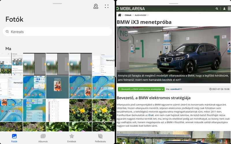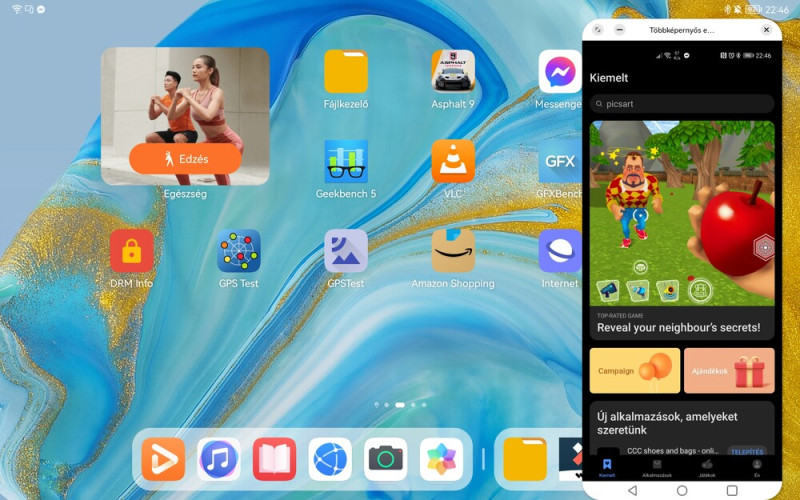 A Watch 3 Prót a tablethez társítva megjelenik az óraképernyőn a tablet kameraszoftvere, és idővel a csuklóékről is vezérelhetők lesznek az ökoszisztéma beépülő moduljai. Épp ez a lényeg: eszközök és szolgáltatások összevasalása, bár nem kellett eddig Harmony, hogy mondjuk a P40 Pro képernyőjét kitükrözzük a MatePadre, vagy azt egy laptopra. Ez egy érintéssel működik most is, és simán áthúzhatunk fájlokat és szöveget a két cucc között. Sőt: multimédiás appokat, játékokat, böngészőt meg szövegszerkesztőt is kivetíthetünk ablakosan és teljes képernyőre váltva - az utóbbival azért előfordulhatnak elrendezési problémák. Szintén használhatjuk a MatePad képernyőjét és négy hangszóróját, hogy a telefonról játsszunk le multimédiás tartalmakat, és ugyanígy kompatibilis tévére is kiszórhatjuk a vezetékmentes jelet. Nem is teljesen világos, hogy milyen extra jár majd két harmóniás eszköz között, de mindenképp meg fogja könnyíteni a szuperközpont a csatlakozást és a kezelést.