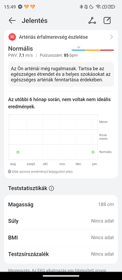 Elég nagy a szórás kapott értékekben, és a tesztidőszakban szezonális betegségekkel, ünnepi kalória- és alkoholbevitellel, valamint komolyabb stresszel is szembenéztem. Nem csoda, hogy az értékek odafigyelést irányoztak elő. A legkövetkezetesebb a Beurer volt, az iHealth és a Huawei gyakran mért ahhoz közel megegyezőt, néha viszont felfele kilengő értékek is előfordultak náluk. Beszédesek az egymás utáni mérések is ugyanazzal az eszközzel, kis szünettel mérések között: a Beurer január 2-án, délután például következetesen közel mért (129/82/94, 131/85/95, 131/86/98), a Watch D2-nél viszont volt kilengés (135/95/101, 137/96/96, 143/96/99).