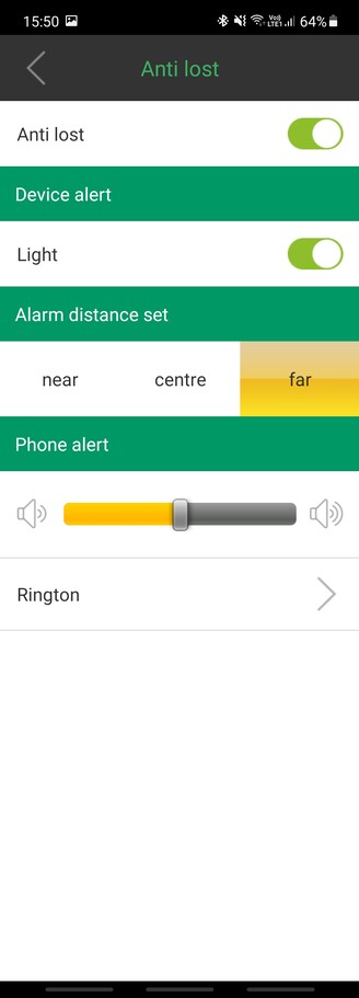 A másik funkció, hogy ha távolodunk a terméktől, akkor egy bizonyos távolság után elkezd csipogni, hogy helló, ne felejts itt. Direkt a “far” opciót választottam, hogy csak akkor ordítson, ha már tényleg túl messze kerülök, de annyira csirke a Bluetooth hatótáv, hogy a szomszéd helyiségbe ugrottam csak át könnyíteni magamon (ez konkrétan három méterre van), ez meg ott prüntyögött az asztalomon. És nem hagyja abba, ha visszatér az ember, csak akkor, ha megnyomom rajta a gombot. Mindez persze kizárólag akkor lehetséges, ha amúgy korábban nem történt meg a force close és az alkalmazás fut a háttérben. Aztán játszottam vele szabad ég alatt, ott már van értelme, hogy három távolsági opció van, az első olyan 3 méter, a középső körülbelül 6-7 méter, a legtávolabbi 10 méternél érvényes. De annyira gyengécske a Bluetooth a motyóban, hogy a zsebrevágott kulcs is néha eltűnik a radarról (aztán csipog), tehát ez az "anti-lost" funkció a mindennapi életben inkább idegesítő, mintsem hasznos.