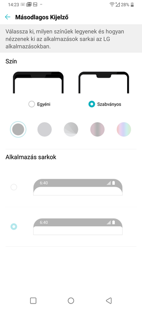 A rendszerbeállítások között viszont rengeteg lehetőségünk van, kezdve azzal, hogy akarjuk-e látni a szenzorszigetet vagy sem. Amit egyébként az LG másodlagos kijelzőnek hív. Az egyéni megoldás tulajdonképpen generál egy minimális kávát a szenzorsziget két oldalának elsötétítésével, olyan, mintha a felső káván lenne az állapotsáv, ami meg kell hagyni, elég klasszul néz ki. Ebben az esetben a lekerekítésről is dönthetünk, hogy szimmetrikus legyen-e a virtuális kijelzőkeretünk az alsó kialakítással vagy szögletesebb, meghagyva a sarkokat. Plusz, ki is lehet színezni.