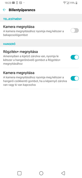 Az alkalmazások gyorsindításának beállításai az úgynevezett Bővítmények menüpontban keresendő, itt engedélyezhetjük, vagy tilthatjuk le a dupla koppos ébresztést, a billentyűparancsokban pedig további opciók felől rendelkezhetünk. Zárolt képernyő mellett a bekapcsológomb dupla megnyomása a kamerát indítja, a hangerő fel gomb a Rögzítés+ nevű felületre navigál, ahol szöveges vagy rajzolt jegyzeteket hozhatunk létre, illetve a kamera együttműködik a hangerő le gombbal is, ha az kényelmesebb, de mindkettő is aktív lehet egyszerre. A Játék menüpontban egyfajta játékmód aktiválható, illetve kérhetünk automatikus szünetet, ha 5 percnél tovább hagyjuk futni a játékot. A program ilyenkor visszafogja a rendszer teljesítményét és csökkenti a fényerőt.