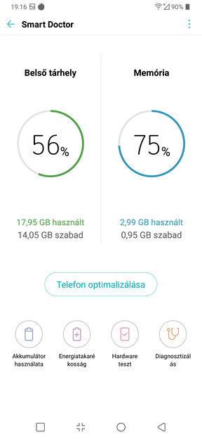 A 32 GB-os, UFS 2.1-es szabványú belső tárhely szintén nem csúcskategória manapság, bár, létezik 64 GB-os verzió is LG G7 Fit+ néven, mi a kisebb kiszerelést kaptuk. Cserébe microSD kártyával mindkettő maximum 2 TB-ig bővíthető. Szoftveresen még az Android 8.1-ra esett a választás októberi biztonsági csomaggal, ami alapvetően 8.0 volt a bemutatáskor, csak azóta szemmel láthatóan frissült. A felület egyszerű és eldzsís, rengeteg személyreszabási és beállítási lehetőséggel. Alkalmazások alig vannak, főképernyőből is ab start csak kettő, viszont nem hiányzik semmi.