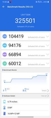 A Snapdragon 765G nem a mobil legkülönlegesebb része, viszont tagadhatatlanul jól viszi a hátán a rendszert, aligha találkozunk akadozásokkal vagy lassulással, és melegedési problémák sem merültek fel tesztidőszakunk alatt. A 7 nanométeres gyártástechnológiával készülő modern rendszerchip Kryo 475 fantázianévre hallgató processzorának két erősebb magja a Cortex-A76-ot takarja, 2,3, illetve 2,2 GHz-es maximális órajelekkel, a maradék hat pedig az energiahatékony Cortex-A55, 1,8 GHz-es maximumokkal. Grafikai oldalon az Adreno 620-ra lehet számítani, RAM-ból minden esetben 8 GB jut, az UFS típusú belső tároló pedig lehet 128 vagy 256 GB-os.