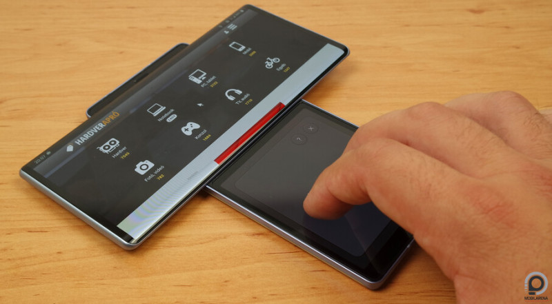 Amikor a mobilt a szokásos, álló nézetben tartjuk, de elforgatva használjuk, a felső, fő kijelző kezdőoldalán csupán néhány gyorsindító jelenik meg (kamera, galéria, YouTube, Tubi, stb.), de az alkalmazásváltóból kvázi bármit előhívhatunk. Rendszerszinten a két kijelző kezelése pontosan úgy történik, mintha egy képernyőt osztanánk meg bármilyen más androidos telefonon, a fő kivétel persze az, hogy itt a rendszer, figyelve a giroszkópot is úgy kezeli a tájolást, hogy az alsó kijelző mindig jól, tehát lehetőleg 90 fokkal elforgatva legyen a felsőhöz képest. Egy kivétel van: ha az adott alkalmazás a fő kijelzőn nem támogat fekvő nézetet, olyankor csak az alsó forog a készülék tájolásának megváltozásával, viszont az alsó kijelzőnél ez sem feltétel, az mindig úgy ad állóképet, ahogy épp az eszközt tartjuk.
