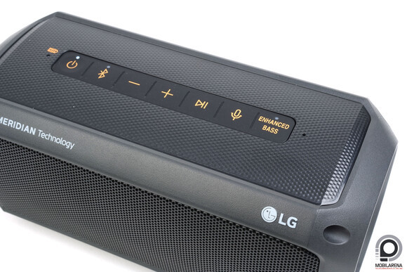 Extra funkciói között a külön bekapcsolható, fokozott basszus mód, az AptX-támogatás, a mobilos hangasszisztensekkel való együttműködés és az IPX7 vízállóság említhető, ez utóbbival nem szokott összejönni a kényelmes távolságból használható és jó beszélgetési hangminőség, de az LG-nél szerencsére sikerült. Örömteli, hogy bár a termék alapvetően tavalyi, de ekkor is gondolták már annyira elavultnak a microUSB-portot, hogy erre egyből Type-C-t tettek. A kezelés nem meglepő módon rendkívül egyszerű, az eszköz tetején kaptak helyet a gombok, bal oldalon egy akkumulátor-állapotjelző kapott helyet, ha fehéren világít, akkor jó a töltöttségünk, ha narancssárga vagy piros, akkor értelemszerűen kezd merülni. A bekapcsológombot szimplán kell nyomkodni, természetesen van állapotjelzője, ahogy a Bluetooth-gombnak is, hiszen 3,5 milliméteres AUX-on keresztül is tud lejátszani. A hangerőszabályzókkal számot is lehet léptetni, van továbbá egy lejátszás/megállítás gombpáros, egy mikrofon a hangvezérlőhöz, illetve a korábban már említett szuperbasszus mód.