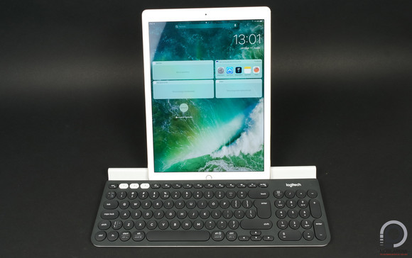 A szóban forgó sín egyébként ránézésre gránitból készült, persze valójában nem, a világos felület gumírozott, biztos és biztonságos teret ad a belerakott eszköznek. A dőlésszög vastagság kérdése, de nagy általánosságban körülbelül 30 fokról beszélhetünk, ami kellemesnek mondható. Mivel a billentyűzet (és így a sín) hossza 380 milliméter, akár egy tablet és egy telefon is befér a tartóba. A képeken látszik, hogy a 12,9 hüvelykes iPad Pro sem tölti ki teljes hosszában a teret.