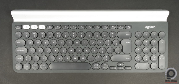 Míg az előd egy afféle kompakt eszköz volt, a K780 már egy teljes méretű, numerikus résszel ellátott klaviatúra, amelyen összesen 97 darab billentyű található, a multimédiás és egyéb funkciókat ellátókkal együtt. A dizájn nagyon egyedi, de nem új, a K szériás testvéreket ugyanebben a szellemiségben tervezték, kerek gombok, kicsit bohém összkép. Egy efféle kiegészítőre talán kár is mindenféle jelzőket aggatni, de az biztos, hogy a szerkesztőségben többen nevezték szépnek. Ami viszont ténykérdés, az az eszköz tömege: 875 grammot nyom, ami nyilván direkt van így, nem a felhasznált anyagok miatt nehéz, hanem felhízlalták, hogy a tetején található tartóba akár egy 12,9 hüvelykes iPad Prót is gond nélkül bele lehessen rakni. A Logitech szerint ez a legnagyobb méret, amit elbír a kiegészítő, fektetve. Azért mi kipróbáltuk állítva is, de úgy is elbírta.