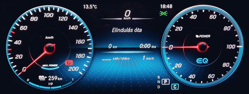 A vezető előtti rész háromféle nézetet nyújt, ezen belül is a kör alakú virtuális műszerek tartalma állítható (kerülhet ide navigáció, fogyasztási statisztikai és pillanatnyi fogyasztás is), a középkonzoli felület is tud három színsémát. Ha már színek: a szivárvány összes árnyalatában pompázhatnak azok a dekorációs fénycsíkok, amik a műszerfalon futnak, de ezeket irgalmatlan hamar kapcsoltam ki, mert remekül tükröződnek vissza a szélvédőn.