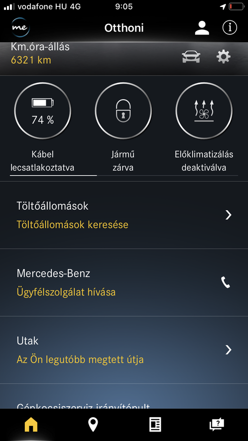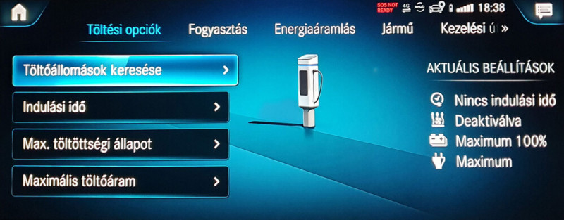 És vannak alkalmazások, mint amilyen egy csomó streaming szolgáltatás (főleg zene), vagy a böngésző, a hotel és étteremkereső. De ezekhez net kell, Magyarországon azonban a Mercedes nem tudott a szolgáltatóval megegyezni, szóval az autóban levő SIM ezeket nem támogatja. Ettől viszont még működnek a telefonra telepíthető és az autóval kommunikáló appok, mint amilyen a Mercedes Me. Egy regisztráció után a távolból is látunk egy csomó információt (legutolsó útvonalunk összegzése, akku állapota, az autó pozíciója, nyitás/zárás, ablakok állapota, guminyomás), ez tök praktikus. Beállítható, hogy publikus tölőpontokon hány százalékig töltsön az autó (mert ha csak 100 kilométert kell megtenni hazáig, akkor lehet, hogy otthon olcsóbb lesz az etetés), van töltőállomás kereső, noha ez nem ismer mindent, plusz azt is látjuk a térképen, hogy milyen messzire juthatunk el a jelenlegi töltöttségi szintünkkel.