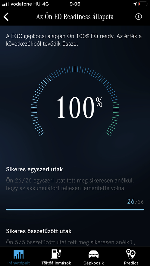 Van egy EQ Ready alkalmazás is, az viszont puszta marketing, autó sem kell hozzá. Ennek alapvetően az a célja, hogy meggyőzze a júzereket, hogy nekik pont kell egy EQC, méghozzá az okostelefonos helymeghatározó és giroszenzoros adatokból dolgozva csinál egy statisztikát arról, hogy napi szinten mennyit közlekedünk, aztán szépen megmutatja, hogy ezt milyen szuperül meg lehetne oldani egy EQC-vel, csak abban nem segít, hogy honnan fog 30 millió beugrani a tárcánkba, hogy meg is vehessük.