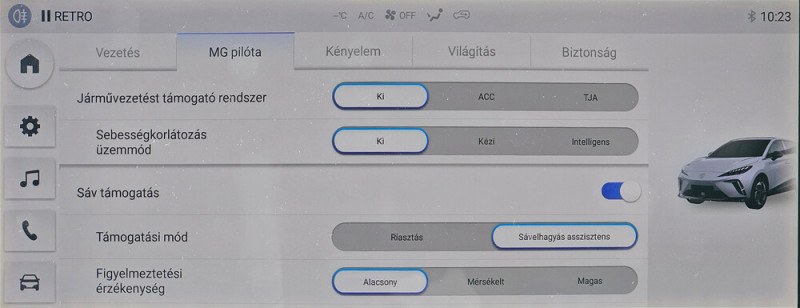 Én őszintén szeretem az ilyen vezetéstámogató rendszereket, örömmel használom őket hosszabb utakon. De itt mindent kikapcsoltam, így egyszerűen nem lehet vezetni. Egyedül a vészfékezési figyelmeztetést hagytam meg nagyon alacsonyra állított érzékenységgel, ami nekem még így is túlmozgásos volt városban, de inkább csipogjon, mintsem valakit utolérjek, szóval ezt nem bántottam. A többi része a rendszernek jelen állapotában szemétre való és ezzel minden indulás után találkozni fogunk, mert persze, hogy visszakapcsolja a sávtartót magától, ráadásul nem a "figyelmeztetés" fokozatba, ami csak csipog, hanem a rángatós üzemmódra. És nem, nincs egy darab gomb, hogy ezt nem kérem, túrjon bele a júzer a menübe.