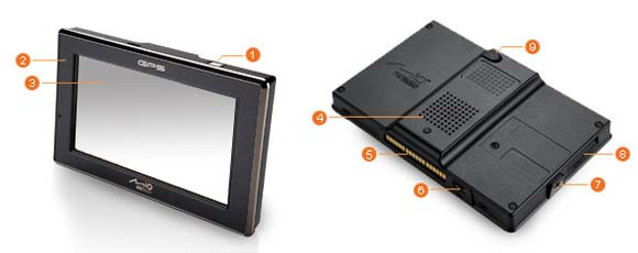 A készülék külsejét tökéletesen mutatja be a fenti ábra, amelyet a gyártó honlapjáról szereztünk. Az eszköz tetején mindössze egyetlen bekapcsológomb (1) található, amelyet 5 másodpercig nyomva tartva tudunk működésre bírni, amennyiben csak egy pillanatra nyomjuk be, akkor a kijelzőt kapcsolhatjuk standby állapotba. Az előlapon a hatalmas, 480x272 pixel felbontású gyönyörű kijelző (3) mellett találhatjuk a Bluetooth bekapcsoltságát jelző LED-et (2). A hátlapon található a hangszóró, amelynek hangereje megfelelőnek bizonyult még lehúzott ablak mellett is. Rögtön felette található az antenna csatlakozója (9). Alul két csatlakozó található, az egyik egy miniUSB (6), a másik pedig arra szolgál, hogy az autós-tartóba illesztve is tölthető legyen a készülék (5), ilyenkor ugyanis magába a tartóba kell beleillesztenünk a töltőt, így elkerülhetjük a folyamatos ki-be dugdosást. Bal oldalra került az SD/MMC kártyák fogadására képes slot (8), valamint a fülhallgató csatlakozója (7). Mint látható egyetlen dolog hiányzik nagyon, és ez talán az egyetlen negatívum, amelyet a teszt alatt felfedeztem, mégpedig a hardveres hangerő-szabályozó. Ez hihetetlenül megkönnyítené a használatot, nagyon nagy problémának tartom, hogy kimaradt.