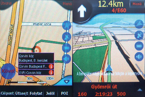 Mostani találkozásunkkor inkább arra voltunk kíváncsiak, hogy hogyan működik az iGO egy olyan készülékben, amely már telefonként is üzemel. Az autós behelyezéshez kapott, szélvédőre tapadó gégecső és a hozzá kapcsolódó tartó nálunk bevált, stabilan fogta a készüléket. Az iGO továbbra is zseniálisan navigál, nehéz bevinni a málnásba, talán csak a túl gyors irányváltások zavarják meg, viszont konzekvensen elnyom minden más funkciót. Ha például hívás érkezik, akkor csörög a telefon, de a térkép miatt nem látjuk, hogy ki keres bennünket, előbb ki kell lépni az iGO főmenüjébe, majd letenni a tálcára az alkalmazást. Ettől függetlenül a telefon persze felvehető, csak én speciel szeretném tudni, hogy mégis milyen vidámsági faktorral ejtsem ki a „halló” kifejezést.