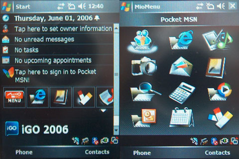 A jól ismert desktop alatt jelenik meg a Mio Menu nevű okosság öt ikonja, amelyek valamelyest szabadon változtathatóak, de összesen csak hétféle funkció választható. Maga a Mio Menu egy nagy ikonokból álló, 12 rajzot tartalmazó felület, amely hasonlít egy hagyományos telefon főmenüjére. Alapvetően nem más, mint a Windows Start menü helyett használható okosság, amellyel egyszerűbben és gyorsabban elérhetjük azokat a funkciókat, amelyek a készülék telefonos részéhez fontosak.