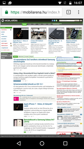 A Chrome rendben kezel több lapot, gyorsan tölti be azokat és a vaskosabb oldalak is megússzák a görgetést minimális megakadásokkal. Ekkora kijelzővel egyébként a netezés és a virtuális gépelés is kényelmes. A Chrome szinkronizálja a Google-fiókhoz tartozó könyvjelzőket és keresési eredményeket, nyomtat, megoszt és vált asztali elrendezésre. Inkognitó lap is nyitható. Bár a Moto G4 Plus csak a szükséges minimumot hozza szoftveresen, pont annyi hasznos app jár mellé, amennyi elég, amíg az ember a kedvenceit lerántja a Play Áruházból.