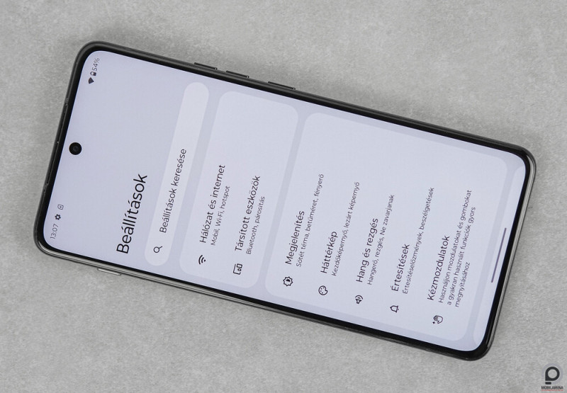 A minden pillanatban tökéletesen gördülékeny felület 1080 x 2400 tűéles, kirobbanó színekkel operáló pixelen jelenik meg perfekt feketékkel és betekintési szögekkel, illetve 1000 nites napfény alatti fénysűrűséggel. Létezik persze élesebb és fényesebb panel, mégsem éreztem a dolog hátrányát a gyakorlatban. Sokrétű kalibrációs opciókkal, éjjel kellően sötét megjelenítéssel és remek érintésérzékeléssel a telefon tehát úgy is igazolja a magas árazást, hogy a hardveres hátrány 2024 közeledtével tetemes. Szerencsére az apró, 32 megapixeles kamera a fénymérő és a közelségérzékelő környékén nem fapados darab, 4K 60 fps videó is rögzíthető vele, lejjebb pedig az pixelek mögé rejtett ujjlenyomat-olvasó operál hibátlanul. Az 5000 mAh-s telep végül nem csak bőkezű, a 15 wattos vezetékmentes töltést is kipipálja.