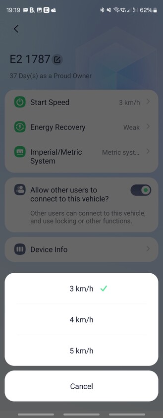 A gépezet Bluetooth segítségével tud telefonnal kommunikálni. Kickscooter by Segway az app neve, de túl sok extrát nem fog nyújtani, amit tud, azt is angol nyelven tudja. Van benne lezárási lehetőség, az így eltolt roller csipog és nehezen mozgatható, de egy 14 kilós gépet akárki a hóna alá csap. Át lehet állítani a mértékegységeket, meg lehet adni, hogy ellökésre induljon csak be a motor, be lehet kapcsolni a rekuperációt. Ez volt az ötösfogatból az egyetlen olyan roller, ahol lehetett érezni, hogy az enyhe lassítás tényleg csak motorfékkel történik, a hátsó dobfék csak komolyabb rántásra lép működésre, viszont kimondottan hatékony.