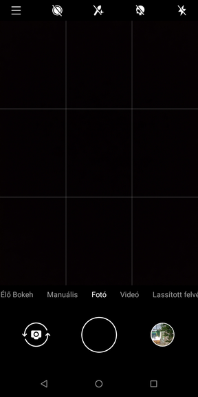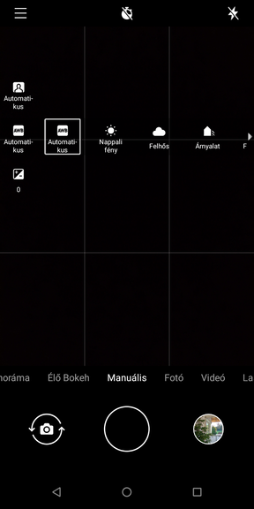 Az felület egyszerű és átlátható, az élőképen lapozgatva találunk 1:1-es képarányt, panoráma módot, élő bokeh portré módot, videót, illetve lassított és gyorsított felvételt. A manuális mód inkább csak jelzésértékű, mindössze a fókuszmódot variálhatjuk, az expozíciókorrekciót +/- 2 tartományban, a fehéregyensúly pedig sematikus. A beállításokban sincs sokkal több opció, lehet kérni helycímkét, vízjelet és segédvonalakat, ide dugták a HDR-t, ami automatikusan dolgozik, illetve a felbontás és képarány is itt módosítható. A 8 megapixeles, fix fókuszos, szoftveres segédfénnyel dolgozó előlapi egységre az exponáló mellett válthatunk, ezt tudja.