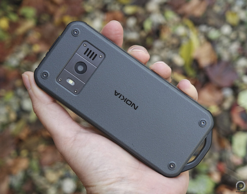 A terepkompatibilitást az alsó, övhöz/karabinerhez való spoiler is előrevetíti, a termékoldalt böngészve pedig ömlenek a rövidítések: IP68-as por és víz elleni védelem (1,5 méter mélység, fél óra), MIL-STD-810G (az ezen belül elvégzett tesztek nem pontosítottak), 1,8 méteres zuhanás kibírása betonon és -20 - +55 Celsius-fok közötti használat. Éppen ezért nem tartottam attól a szűk teszthéten, hogy ha véletlenül, netán „véletlenül ;-)” leejtem, a 2,4”-es, 240 x 320 pixeles TFT panelnek baja lesz, a kijelző ráadásul odakint remekül látható, noha éjjel lehet jóval sötétebb. Nyilván nem a gyér betekintési szögekkel, a 256 ezer színnel és a múltidéző pixelességgel érdemes YouTube videót nézni, bár egyébként döbbenet: ezzel a Nokiával azt is lehet.