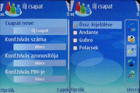 Az új funkció neve: csapatok. Ez amolyan mobilos teamroom, vagy workteam utánzat. Létrehozhatjuk a csapatot, a névjegyzékből kell kiválogatni a népet, aztán ezeknek az embereknek egyszerre küldhetünk üzenetet, "felkonferenciahívhatjuk" őket, adóvevőzhetünk velük (Push-To-Talk), illetve a híváslistát szűri meg oly módon a szoftver, hogy csak a csapattagokkal történt kommunikációkat lássuk időrendben. Nekem ez nem okozott akkora extázist, majd az lesz a pöpec, ha majd valami szerveren tárolt dokumentumokat share hozzáféréssel közösen szerkesztgethetünk mobilról, de arra még várni kell.