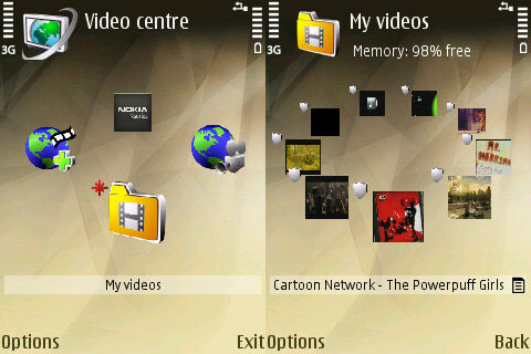 Szintén új menüpont a Videóközpont, amely első blikkre nem akkora durranás, mint ahogyan a neve sejtetni engedi. Belépve négy ikonból álló menü fogadja a felhasználót, amelyek körbe-körbe forognak. A négyből három egyből fel akar vinni az internetre, hogy onnan rántson le az ember videót (YouTube videók is megtekinthetőek), az egyetlen netkapcsolat nélkül üzemelő funkció a My Videos, ahol a saját magunk által felvett, illetve a gyári mozik bélyegképe üldögélnek körben, ezekre kattintva pedig semmi extra nem történik, indul a RealPlayer, és játssza a mozit.
