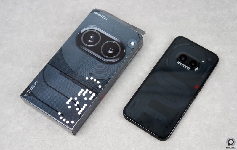 Fogunk a design kapcsán pozitívan is értekezni, de Nothing eszközök csomagolása főleg tesztelői oldalról rémálom: a konkrét dobozt fedő papírburkolatot csak úgy lehet megbontani, hogy azt soha vissza nem csomagolja az ember, mert el kell szakítani. Ez minden Nothing termékre egyaránt jellemző és nehéz megéretni az okát. Utána viszont egy kemény kartonból készült, a telefon hátlapjának mintázatát dombornyomva utánzó szelencét kapunk, ami nagyon nívós, de a készüléken és a Type-C kábelen kívül nincs benne semmi. Viszont még a kábel is egyedi: mindkét végén a csatlakozó ezüstösen csillog és ott figyel a cég márkajelzése is rajta.