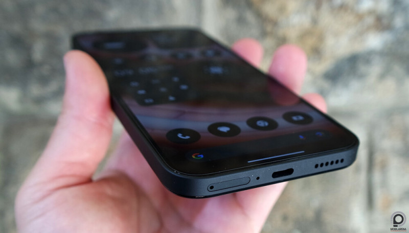 Az IP53-as védelem a fröccsenő vízzel szemben biztosít némi ellenállóságot, a matt fekete keret jól néz ki, a hátlap viszont eléggé gyűjti az ujjlenyomatot. Tokot rá! - mondhatnánk, de ha a tok nem áttetsző, akkor ezzel kinyírjuk a Glyph-iterfész láthatóságát. A korábbi modellekhez már vannak olyan tokok, amik pont ott vannak kivágva, ahol a LED-ek ülnek, nyilván ehhez a telefonhoz is lesz majd ilyen. Az általános kiviteli minőség kifogástalan, nem lötyög semmi, tökéletesek az illesztések, jól meg is lehet markolni a telefont, a kávák szimmetrikusak a kijelző körül, mind a négy sarok szépen ívelt, egyáltalán nem érződik a külsőn, hogy ez a Nothing legolcsóbb modellje.