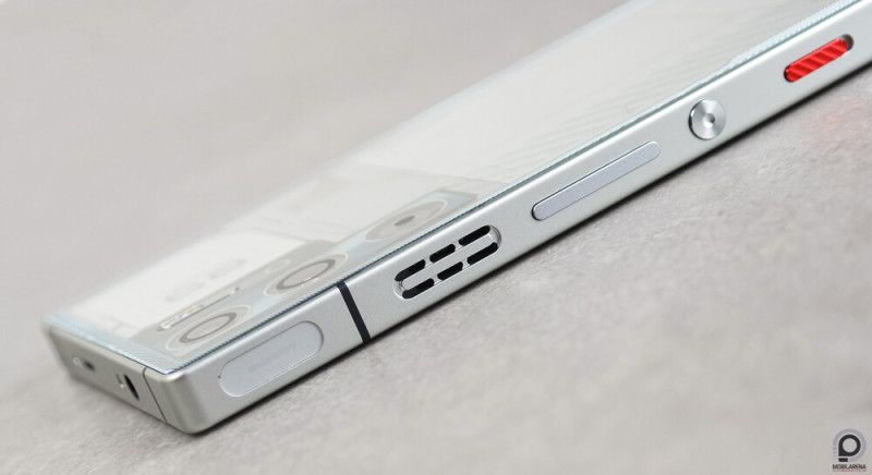 Pedig olyan trükköket is tartogat bónuszként, mint a jack kimenet és az infraport felül, a sztereó hangszóró egyik rácsának társaságában, míg alul a DisplayPort kimenetes Type-C port és a dupla nanoSIM tálca a hangszóró szomszédja, egy-egy mikrofonnal. A hosszú hangerőszabályzó, a kerek bekapcsoló és a játékmódot indító, piros kapcsoló pont elérhető egy kézzel, és erre van a harmadik mikrofonfurat. A forma és a kivitel a szerkesztőség egybehangzó véleménye szerint csillagos ötös, ahogy a képernyőbe rejtett ujjlenyomat-olvasó is hibátlanul tevékenykedik, szemben a sokkal korlátozottabb, bár ügyesen rejtőzködő szelfikamerával.