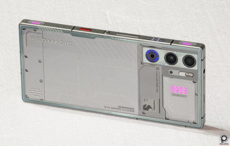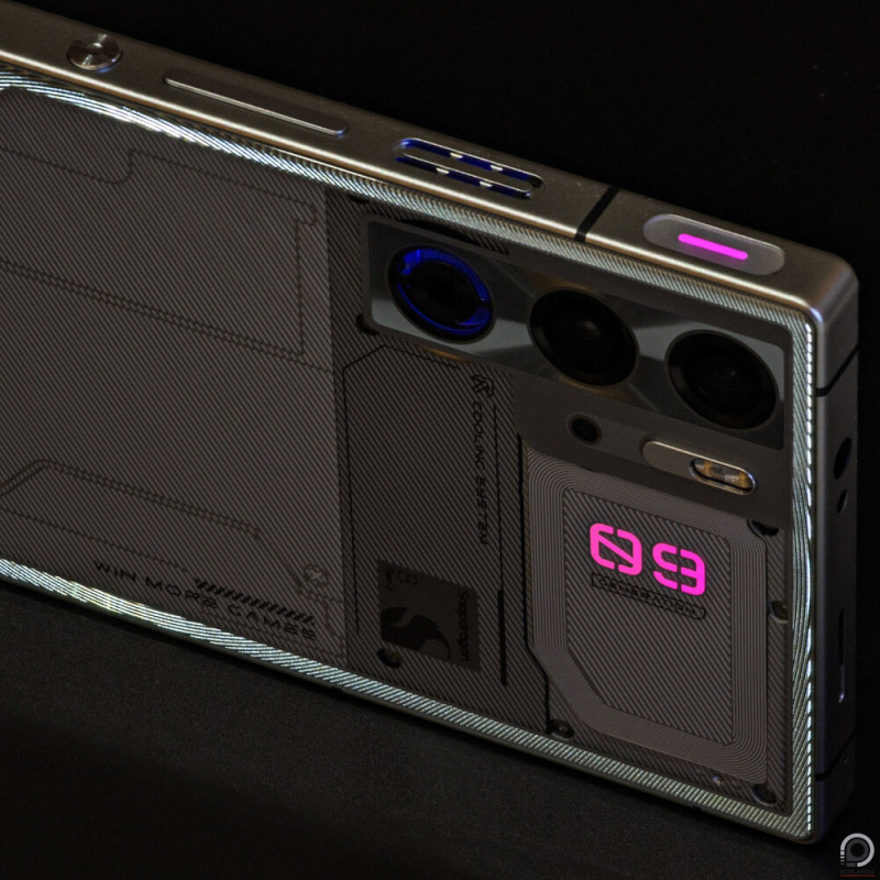 Nem lenne a Red Magic gaming telefon, ha ennyi lenne a történet: hosszú oldalon két 540 Hz-es, programozható érintőgomb várja a mutatóujjakat, és itt két csík, hátul pedig a 09-es sorozatjelzés és a 22 ezer RPM-re növelt ventilátor kapott programozható RGB fényt – utóbbi a két 50 megapixeles kamera alatt harmadik lencsének álcázva magát. Amennyire lapos a hátlap az optikákat is elfedve, annyira sokrétű a mintázat alatta 2 megapixeles makrókamerával és dupla LED villanóval megspékelve. A szélek kaptak némi fényvisszaverő réteget, és ez is ad egy extra karaktert a jól kinéző ezüst változatnak. Számomra mégis a fényes és matt fekete változat az igazán szemrevaló.