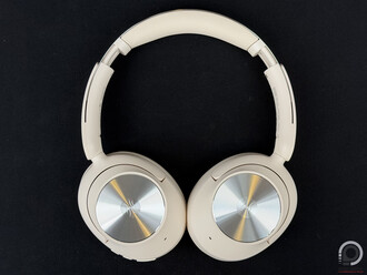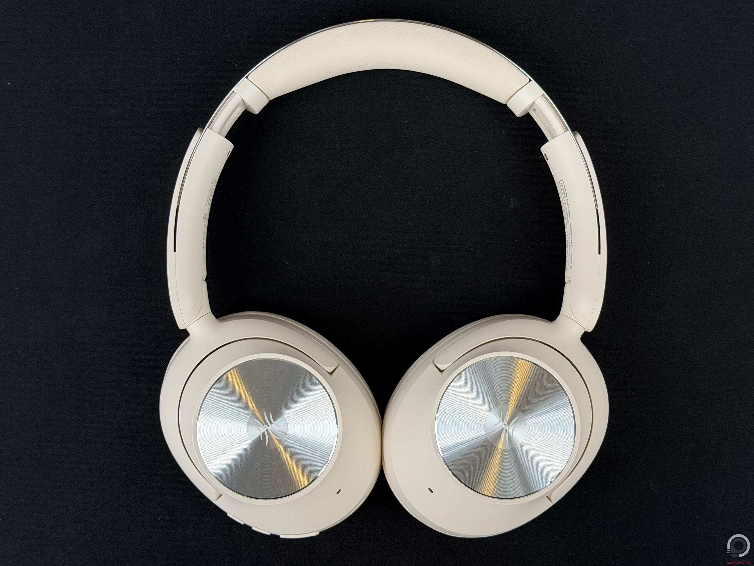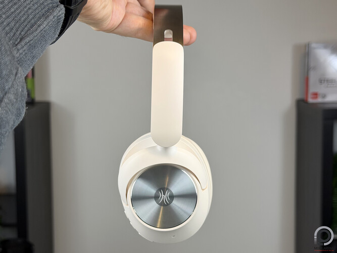 Over-ear, vagyis a fülkagylót körülölelő kialakítása van a Focus A6-nak. A krém színű modell és a fekete verzió kagylóinak külsején is fémes, recés kör található, benne a márka logójával. A kis recékkel vinyl lemezre emlékeztet az ezüstös berakás, szerintünk jól mutat. Fém még a fej tetején ülő keresztpánt is, és érdekes, hogy nem fedi műanyag felülről. Érezni viszont, hogy a szélesség állításakor kattannak fogak, nincs az Apple AirPods Maxhoz hasonló fokozatmentes beállítási lehetőség.