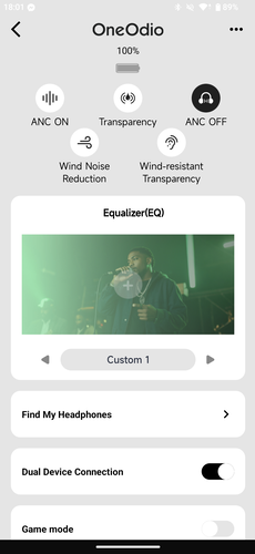 Szintén hiányzik az alkalmazásból a gombok funkcióinak beállítása. Az ON/OFF szolgál az eszköz be- és kikapcsolására, bekapcsolást követően nyomva tartva ez indítja a párosító módot is. Használat közben egy rövid nyomás az ON/OFF-ra a lejátszás/szünet. Két nyomás az ON/OFF-ra elindítja a telefonon futó asszisztenst. A hangerőszabályzón egy nyomással állítható a hangerő fel vagy le, nyomva tartással pedig előre vagy hátra lehet léptetni a lejátszott tartalmat. Az ANC gomb csak egyszeri rövid nyomásra reagál, és vált a különböző módok között – ANC be, ANC ki, hangátengedés –, de a szélhez optimalizált zajszűrés csak az appon belül indítható el. Hiányzik sajnos a viselést érzékelő szenzor is, így nincs automatikus szünet-lejátszás, amikor a fejhallgatót levesszük vagy feltesszük. Ellenben az alkalmazás lehetőséget biztosít rá, hogy automatikus kikapcsolást állítsunk be, ez szólhat 15, 30, és 60 perces tétlenségi intervallumra. Ha akarjuk, a maximális hangerőt is korlátozhatjuk az alkalmazáson belül, és van virtuális EQ is, erről már a következő oldalon.