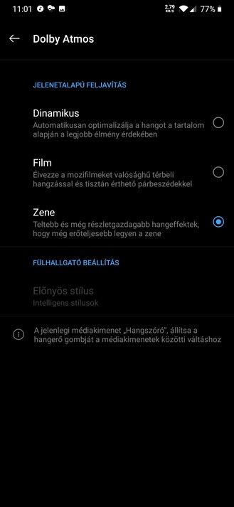 Bár az alsó rácsot könnyű eltakarni játék közben, picivel erélyesebb a felsőnél, az viszont előre sugároz, így sosem éreztem azt, hogy valamelyik fülemre kevesebb hang jutott volna. A maximumon roppant erélyes, bár már elég zúgós a produktum, lejjebb véve viszont még bőven elég a hangerő, és kifejezetten jó a minőség egy kevés térrel és mélyhanggal megspékelve. Egy-két zeneszám esetében, a maximumon ugyanakkor lefüleltem némi hangerő ingadozást – alighanem valamiféle dinamikus normalizáció zavar be, talán a felkínált Dolby sémák, ezeket viszont nem lehet kikapcsolni.