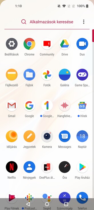 A rendszer kivételesen reszponzív és bámulatosan gyors, nem mellesleg a legfrissebb elérhető verzió. Az új dizájn szerintem roppant tetszetős, még mindig választhatunk, hogy alkalmazásmenüt szeretnénk, vagy mindent a főképernyőkön tudni, és még felesleges alkalmazásokkal sem dobálták tele. A Google szoftvercsomagján kívül kizárólag a GameSpace kapott helyet, ami optimális feltételeket teremt játékhoz, a OnePlus jegyzet, saját fájlkezelő és a OnePlus Community app. Csak a Netflix maradt mint harmadik féltől származó alkalmazás, de ez a HDR10+ támogatással rendelkező, 120 Hz-es AMOLED kijelző és a Widevine L1-es biztonsági szint mellett végül is érthető.