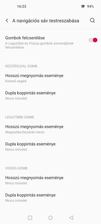 A gesztusvezérlés értelemszerű, a virtuális navigációs gomboknak viszont nem csak a sorrendje módosítható, de mindhárom gomb úgy értelmezi a nyomva tartást vagy a dupla érintést, ahogy mi óhajtjuk. Ezzel összesen hatféle opció válik elérhetővé, megoldva többek között azt a problémát is, hogy az értesítősáv nagyon magasan van, de a kezdőképernyőn lefelé simítva nem az, hanem a Shelf kerül elő. Ha mindkettőt szeretnénk, akkor maradhat a Shelf, a gyorskapcsolópanel és az értesítések kezelését pedig bármelyik navigációs gombra ráküldhetjük, így semmiért nem kell nyújtózkodni.