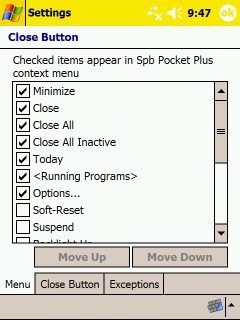 A legfontosabb egy olyan szoftver megléte, ami befolyásolja a jobb felső sarokban található X gomb működését. Ez ugyanis alapértelmezésben nem becsukja, csak lekicsinyíti a futó programot, amit a laikus felhasználók általában nem tudnak, csak azt veszik észre, hogy gépük egy idő után hihetetlen mértékben lelassul. Ennek oka az, hogy több tucat program fut a háttérben, melyek használják az értékes memóriát. A HTC-ken ez a probléma gyárilag javítva van, a többi masinán viszont szükséges egy külön szoftver telepítése. Ezek közül az egyik legjobb a már részletesen bemutatott SPB Pocket Plus 4.0, mely számos kényelmi funkcióval egészíti ki az operációs rendszert, viszont fizetős. Ha valaki ingyenes megoldást szeretne, az telepítse fel a mindössze 21 KB-os vBar-t.