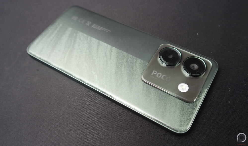 A hátlapon jókora Poco felirat került a testvérmodell azon részére, amely ott egy harmadik kamerát visel, de egyáltalán nem ordítóan harsány a design, ebben a zöldben jól néz ki a kettéosztott hátsó kialakítás. Persze az asztalra téve ez is billeg, amit a mellékelt tokkal szinte teljesen el lehet tüntetni. Az általános összeszerelési minőség oké, a gombok kényelmes helyen vannak, a kijelző alá tett ujjlenyomat-olvasó is rendben teszi a dolgát.
