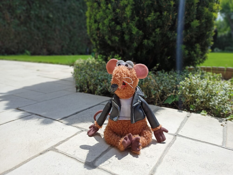 A 16 megapixeles szelfikamerához rengeteg szépítő opció áll rendelkezésre, ezeket az AI vezérli, alapvetően megfelelő érzékkel, de ha technikolor jellegű sminket és viaszból öntött arcot szeretnénk, magunk is adjusztálhatjuk a különböző értékeket. A képek egyébként kivétel nélkül felülexponáltak, a színek pedig picit túltelítettek. A portrék viszont meglepően jók. A fénypászmát leszámítva, ami user error, kivételesen pontos a téma elhatárolása. Egy szőrös plüssel azért kellő kihívás elé néz a rendszer, de Rizzo haja is szálra kivehető (a jobb füle mögött).