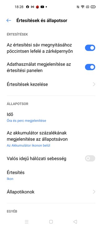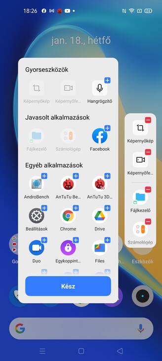 A menü elrendezése lehet főképernyős halom és külön alkalmazásmenü által vezérelt, mindkét esetben négy, vagy öt ikon lehet egy sorban. Van automatikus kitöltés, hogy ne legyen foghíjas a kép, mozgathatunk és csoportosíthatunk is egyszerre alkalmazásikonokat, van duplakoppos lezárás, azt külön imádtam, hogy van olyan lehetőség, hogy ha alulról elkezdjük bármelyik oldalon felfelé csúsztatni az ujjunkat, akkor a főképernyő ikonjait összehúzza kicsire és odarakja az ujjunk mellé, hogy egy kézzel is tudjunk választani. Ezen kívül van intelligens oldalsáv (edge panelnek mégsem nevezhetik, pedig az), akad egy csomó gesztusvezérlési trükk, szóval az a lényeg, hogy a Realme UI 1.0 továbbra is egy tök okos felület, csak ez az okosság nincs az arcunkba tolva izomból, hanem alapvetően egy gyárihoz közeli Android érzést ad, de igény szerint fel lehet pimpelni.