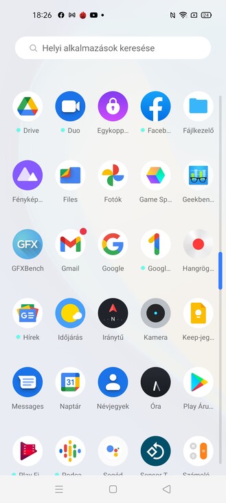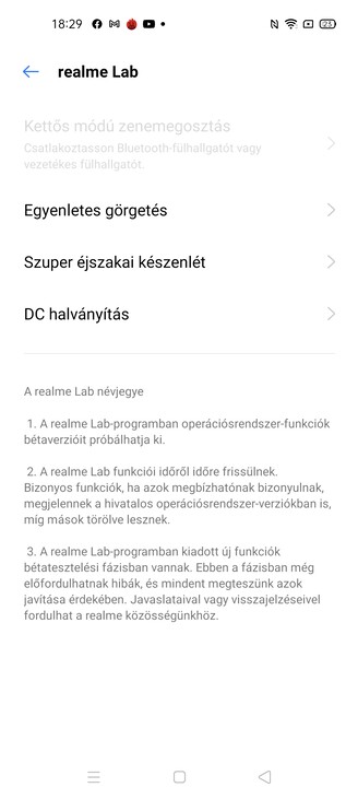 És még ezen kívül is van ötlet, a Realme Lab menüpontja mögött három spéci funkciót találunk, amit be lehet kapcsolni és visszajelzést adhatunk róla, hogy tetszik-e, vagy sem. Az elsőnek egyenletes görgetés a neve, bekapcsoltam, de nem láttam különösebb eltérést. A szuper ájszakai takarékos mód éjjel leveszi az adatkommunikációs szolgáltatásokat, hogy spóroljon az akkuval, a DC elsötétítés pedig az, ami. A gyári alkalmazáslista nincs túltolva, fent van a Facebook, a Game Space, ahol a játékaink sorakoznak, kapunk fájlkezelőt és telefonkezelőt (optimalizálás, adatvédelem, fizetési védelem), illetve van saját fejlesztésű zene- és videolejátszó. Akad egy iránytű, egy telefonklónozó a költözéshez, egy diktafon és egy számológép is.
