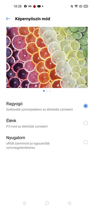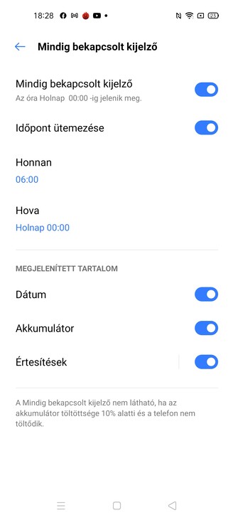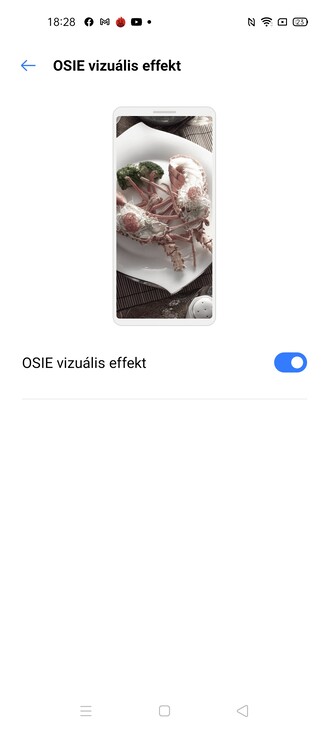 A beállítások között találunk always-on megoldást időzíthető formában, a sötét mód és a szemkímélő mód is köthető időponthoz (előbbi a napkelte-napnyugta vonalon is mozoghat), de nem csak így lehet a színhőmérsékleten csavarni, hanem élénk, ragyogó és nyugalom névre hallgató sémák között is válogathatunk, plusz egy OSIE effektet is rá lehet küldeni a megjelenített képre. Na, ez megint kicsit ilyen TÜV-trükk, ezt az Oppótól vették kölcsön (ahogyan a UI-t is), elvileg azt tudja, hogy egyrészt tol egy kicsit a szaturáción, másrészt ha nem nézünk a kijelzőre, akkor leállítja a videók lejátszását. De ezt csak pár app tudja (mondjuk a TikTok), szóval nem véletlen, hogy alapból ki van az egész kapcsolva, gondolom az üzemidő látja a dolog kárát.
