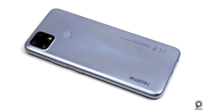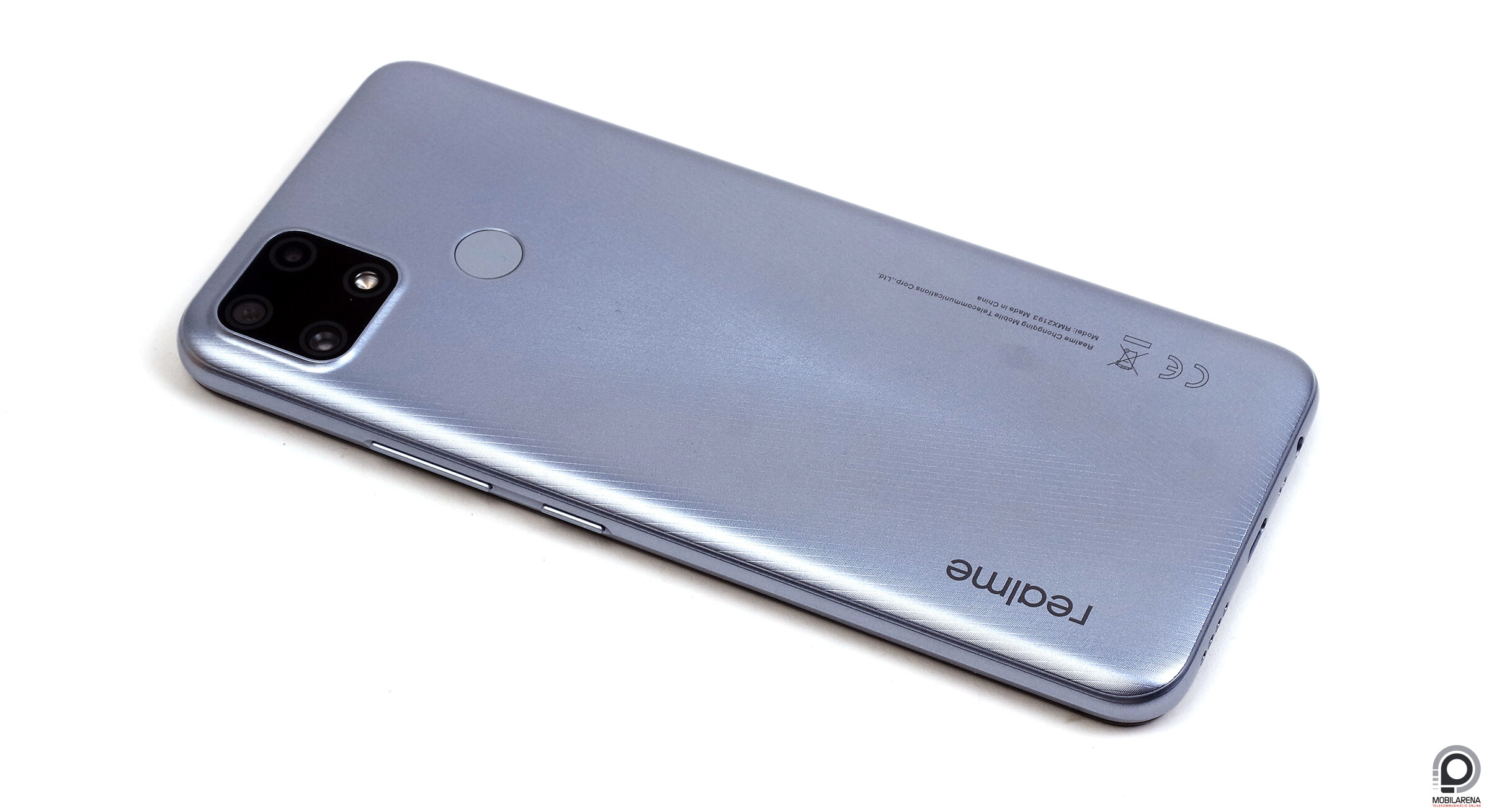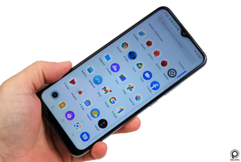 Tesztkészülékünk szürke színben futott be (Glory Silver), elvileg létezik egy világoskék árnyalat is, az talán kissé kevésbé tűnik visszafogottnak, mert itt hiába van V alakú hajszálcsíkozás a hátlapon, ettől még nagyon ingerszegény a kialakítás. Az előlapot a kijelző donimálja, az alsó káva kissé vaskos, felül pedig a szelfikamera cseppje lóg bele a képbe. A 6,5 hüvelykes átlóhoz 720 x 1600 pixeles felbontás tartozik, ez tipikusan egy olyan pont, ahol a Realme elmarad a Poco/Redmi vonal ajánlatától, de a többi konkurens (Nokia 3.4, TCL 20 SE) szintén HD felbontáson ragadt. A kijelző IPS, ebben a kategóriában ez megszokott, a gyártó 450 nites fénysűrűséget ígér, amit műszeres méréseink is alátámasztanak. Ez sem kiemelkedő, de a célnak megfelel.