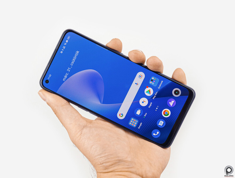Sajátos egyveleg kúszott fel tehát a 150 rugós kategóriába, és szerencsére ezzel nem nőtt meg a mérete (160,2 x 73,3 x 8 milliméter, 182 gramm), úgyhogy én egy kézzel kényelmesen használtam, gombjait könnyen elértem és egy-egy óriáskészüléknél észrevétlenebbül vágtam zsebre. A plasztik váz illesztései hibátlanok, az üveg hátlap jól tapad a tenyérhez, és ha már maradt elöl képernyőkeret, legalább elmaradnak a vétlen érintések a jó érzékenységű panelen. A Realme a haptikus motor visszajelzéseire is odafigyelt, a fénymérő, közelségérzékelő és a beszédhangszóró pedig a 16 megapixeles szelfilyuknál is kevésbé tolakodó.