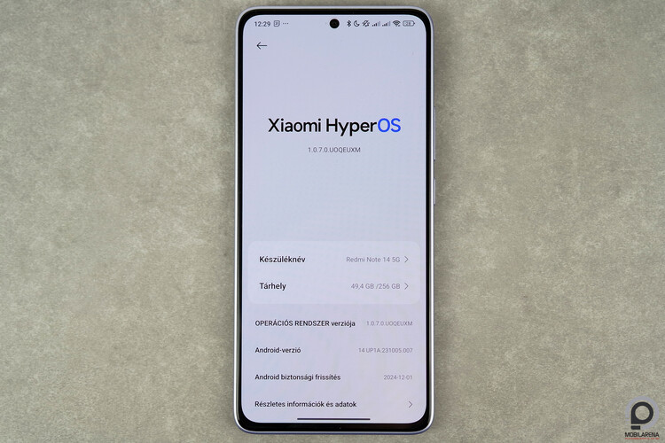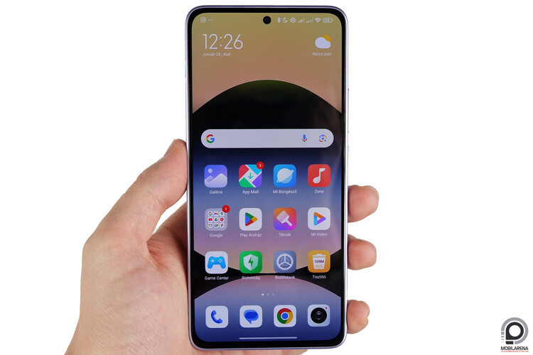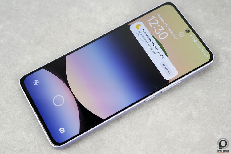 Van napfény-mód, olvasómód, állítható a színhőmérséklet, tudunk ütemezni sötét témát a HyperOS-en, van érintésre tíz másodperces időre megjelenő mindig éber kijelzés. Ezek mellett megvan a kijelzőbe integrált optikai ujjlenyomat-leolvasó is, valamint a felül-középen az AMOLED-be lyukasztott 20 MP-es előlapi kamera is használható 2D-s arcfelismeréssel a képernyőzár feloldására. A százezer forint körüli kategóriában potens ez a panel, ami furcsa volt, hogy méréseink során a pontszerű fénysűrűségre nem tudtunk magasabb értéket mérni, mint a teljes kijelzős fehér megjelenítésre. Mindenesetre elég ez arra, hogy kényelmesen olvasható és látható maradjon a kijelző kültéren is. Ha valamin változtathatnék, akkor az egy normális mindig éber kijelzés lenne, lévén nincs értesítésjelző LED sem, az órát és a bejövő értesítések ikonjait jó lenne anélkül is látni, hogy a telefont meg kelljen mozdítani vagy kocogtatni, de ezt valamiért a Xiaomi a középkategóriás mobiljaiból rendre kihagyja.